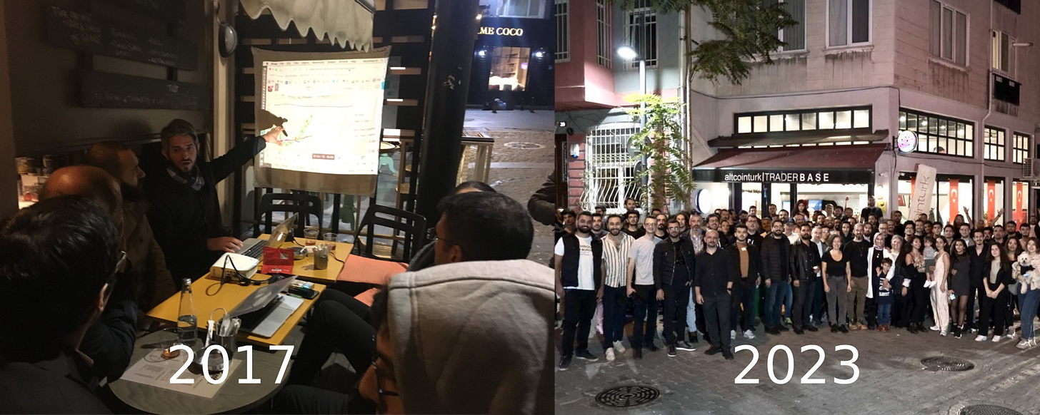 2017’de kripto para piyasaları daha dutlukken faaliyetlerine başlayan bir topluluk Altcointurk. Kadıköy’de bir kafede masa örtüsüne yansıtılan projeksiyon ile kripto para piyasaları bilinci aşılama niyetiyle başlayan buluşmalar, şimdi yine Kadıköy’de kendi yerlerinde, Altcointurk Base’de gerçekleşiyor. Arkadaş sohbetinden, her cuma hiç aksatmadan yapılan muazzam bir etkinliğe evrilen KriptoCuma buluşmaları 200’ü geçti. Tam bir hayaldi, gerçek oldu örneği.