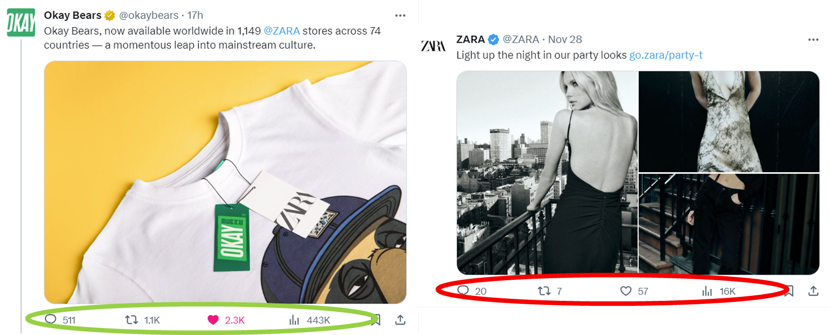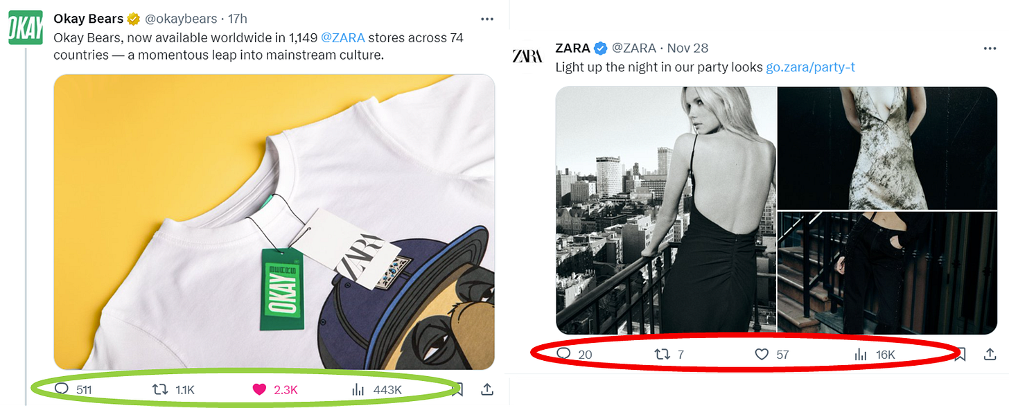 Ev alırken en önemli kriter lokasyon, lokasyon, lokasyon diyen Tebernüş bey gibi olduk ama konumuz yine aynı. Topluluk. Topluluk bu markalar için ücretsiz reklam gücü demek. Hemen bir örnekle gösterelim. 121.000 takipçili Okay Bears’ın duyurusunun aldığı etkileşimi 10 katı büyüklüğünde 1.3 Milyon takipçili hesaba sahip Zara tweetiyle karşılaştırdığımızda sonuç bu şekilde